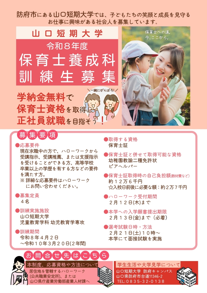 山口短期大学では、令和8年度「保育士養成科」訓練生を募集しています。